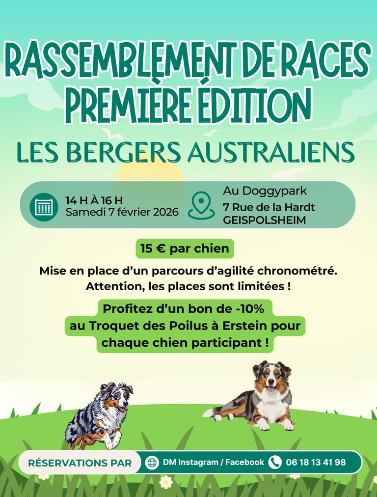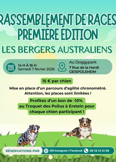 Au programme : Rendez-vous de 14h à 16h au Doogypark à Geispolsheim pour un lâcher de bergers australiens dans tout le parc avec un parcours d'agilité chronométré.