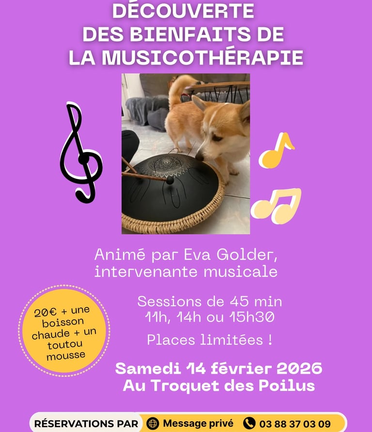 Au programme : Découvrez les bienfaits de la musicothérapie sur les chiens ! Grâce aux sons, aux rythmes et aux vibrations, elle permet notamment de réduire le stress, de favoriser l'apaisement et d'offrir un moment de connexion et de présence avec votre poilu.