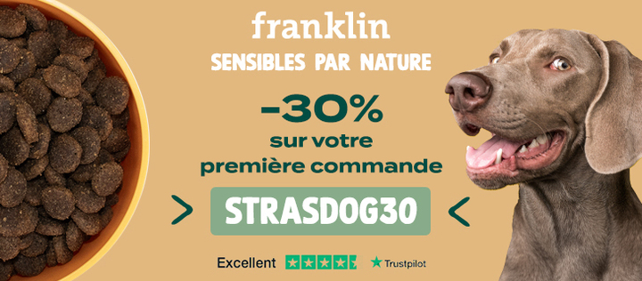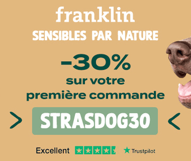 Depuis le mois de septembre 2024, nous avons le plaisir de collaborer avec Franklin Pet Food, une marque recommandé par les vétérinaire avec une seule source de protéine par recette, des ingrédients limités et sans céréales. Vous pouvez également faire un Bilan Nutritionnel sur le site : pour trouver la routine alimentaire adaptée à votre petit protégé. Grâce à ce partenariat vous pouvez avoir 30% de réduction sur votre première commande grâce au code STRASDOG30.