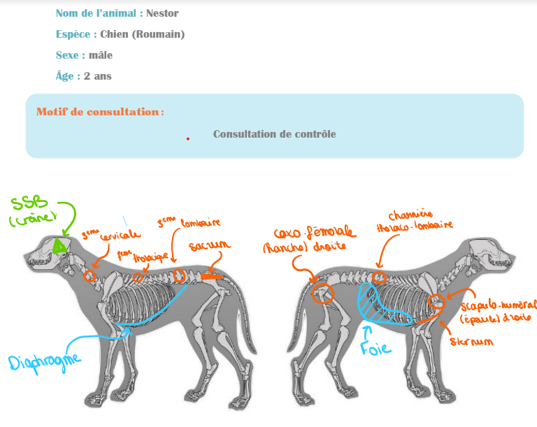 Pour les chiens, même principe ! Leurs balades, leurs jeux, leurs sports, tout est inscrit sur leur corps et également représenté par des dysfonctions. Cela se traduit par des zones où ils n'aiment pas être caressés, des mouvements qu'ils ne veulent pas faire (s'asseoir sur les deux fesses, sauter sur le canapé, monter les escaliers,...). Visuellement, on peut souvent observer des chiens dont les fesses vont plus d'un côté, une patte qui s'étend un peu plus loin que l'autre, la queue toujours du même côté. Bref pleins de petites choses qui semblent anodines mais qui sont en fait des petites douleurs créées bien souvent par des dysfonctions ostéopathiques.