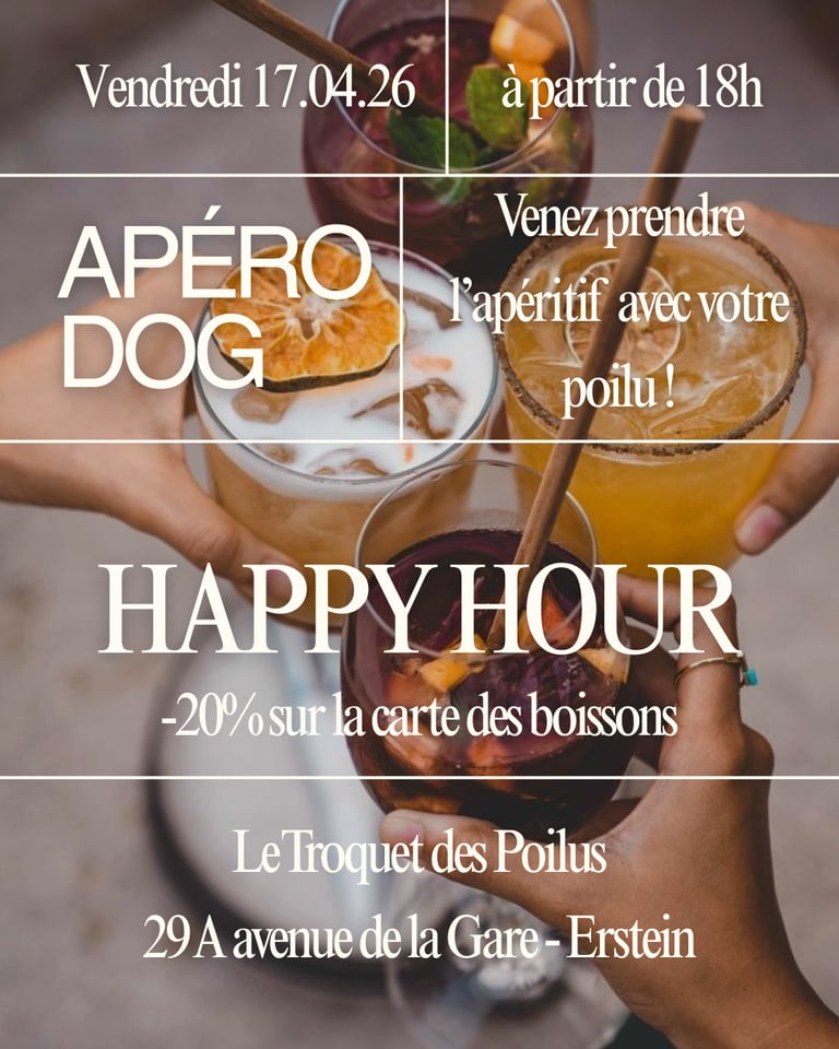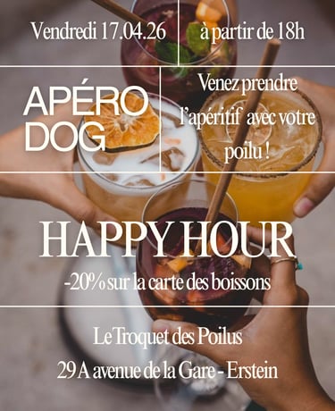 Au programme : Venez prendre l’apéro avec votre toutou, happy hour avec -20% sur les boissons, à partir de 18h au Troquet des Poilus à Erstein